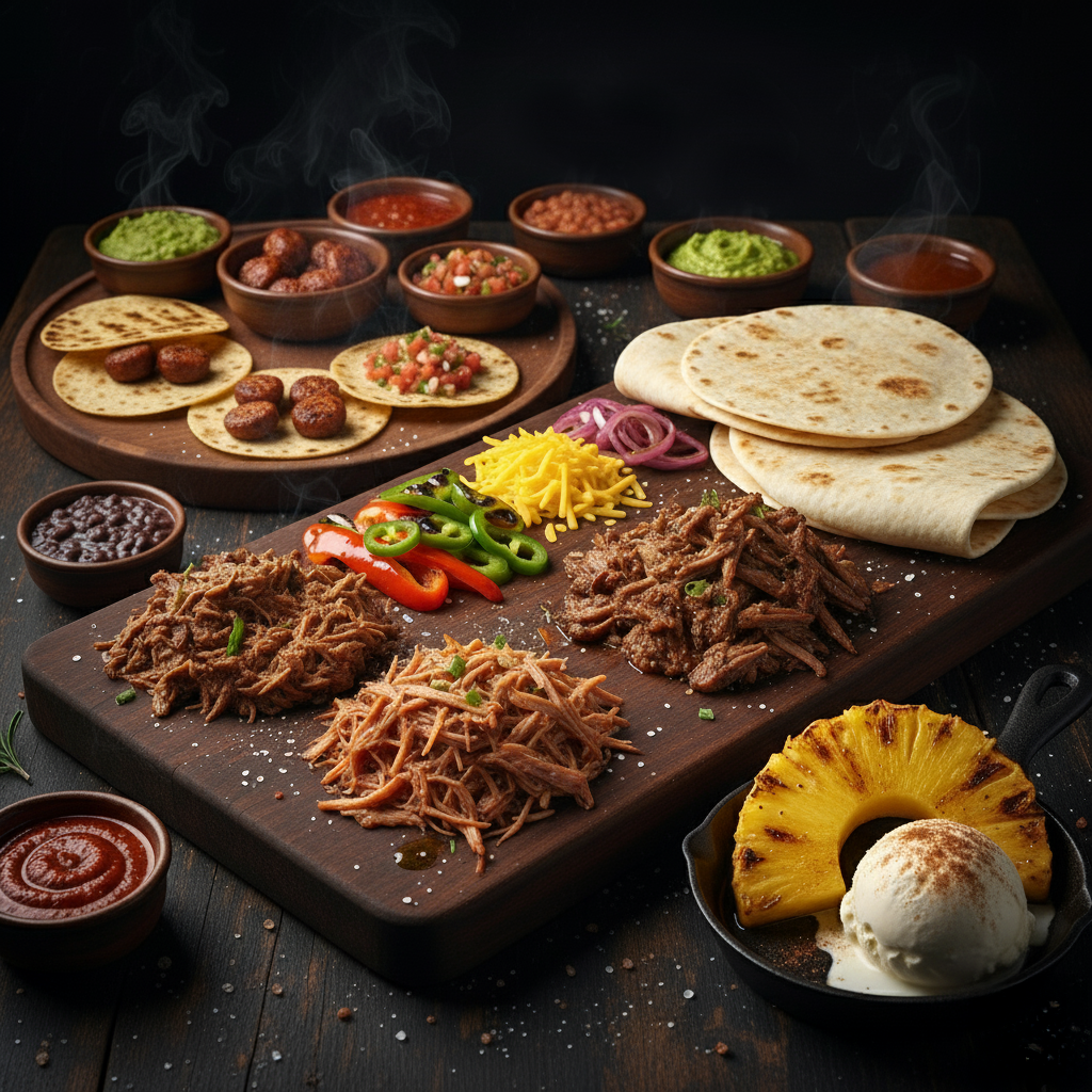 Burritos para armar al gusto de cada invitado. Tortillas a la brasa, carnitas de res asadas a la parrilla, pull pork (bondiola de cerdo a la parrilla) 300 grs. entre las dos proteínas.