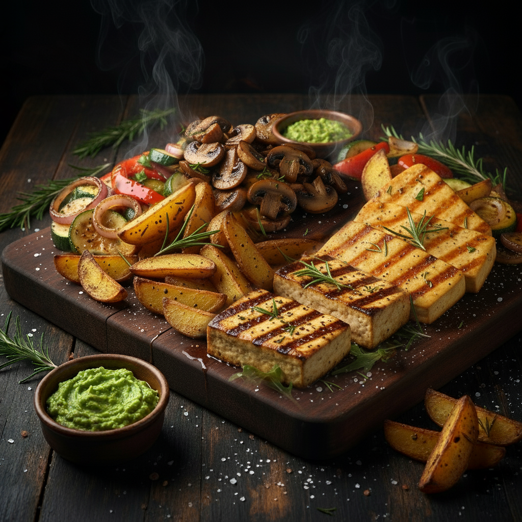 Tofu a la parrilla, + champiñones y vegetales salteados ( cebolla cabezona, zuquini y pimentón) + papa al romero.